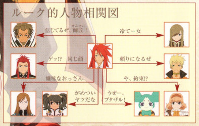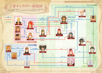 この項目にはテイルズオブジアビスに登場する以下のキャラクター(並びは五十音順)の相関図が2ページにまとめられて載っています。