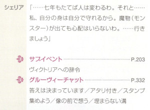 本書ではメインシナリオだけでなくサブイベントとチャットのセリフも網羅しているので、下の画像の様にあらすじ内で発生するサブイベントとチャットのタイトルとセリフ掲載ページ数が載っています。