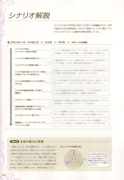 この項目にはメインシナリオの幼年期から未来への系譜編までの以下の情報がゲーム中の「ブック」にある「あらすじ」毎に載っています。