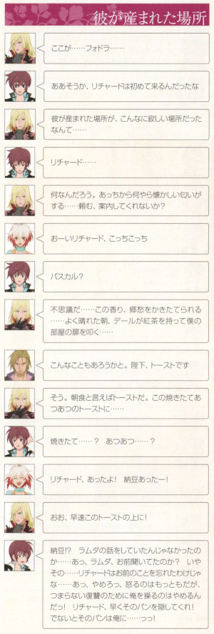 この項目にはテイルズオブグレイセスfのメインシナリオライター田中豪氏が書き下ろした下表のチャットが載っています。