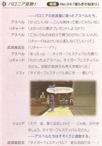 | バロニア見物1 | あらすじ04 | アスベル・ソフィ・リチャード・シェリアの4人でバロニアを見物している時に武具屋横に飾ってある剣を調べる。 |