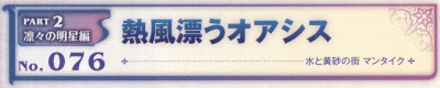 パートは「魔核奪還編」「凛々の明星編」「星喰み編」の内のどれに該当するかが記載、シーンの番号(No.076)とタイトル(熱風漂うオアシス)はゲーム中の「ライブラリ」にある「あらすじ」に対応しています。