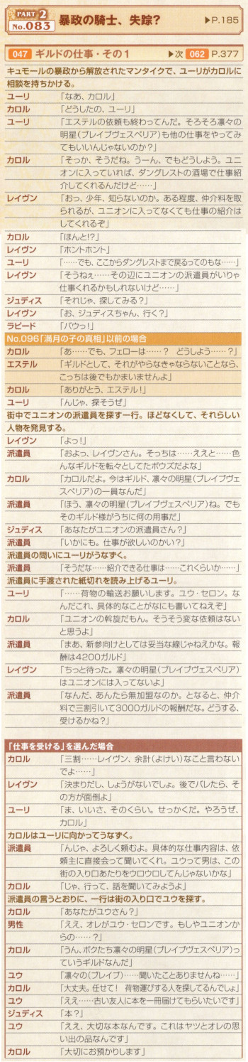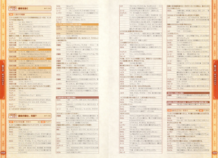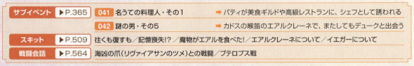 あらすじ内で発生するサブイベント、スキット、戦闘会話には下の画像のように本書でのセリフが載っているページ数も載っています。
