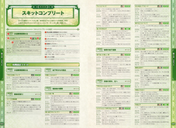 掲載スキットは物語の進行度に応じて発生する「時期固定スキット」とその他発生条件がある「特殊発生スキット」に分けられており、時期固定スキットは時期順に、特殊発生スキットは「すきっとぷれいやーV」と同じ順に載っています。