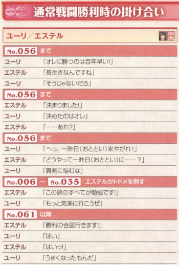 この項目には以下のタイミングでの戦闘開始時と戦闘勝利時のセリフが載っています。