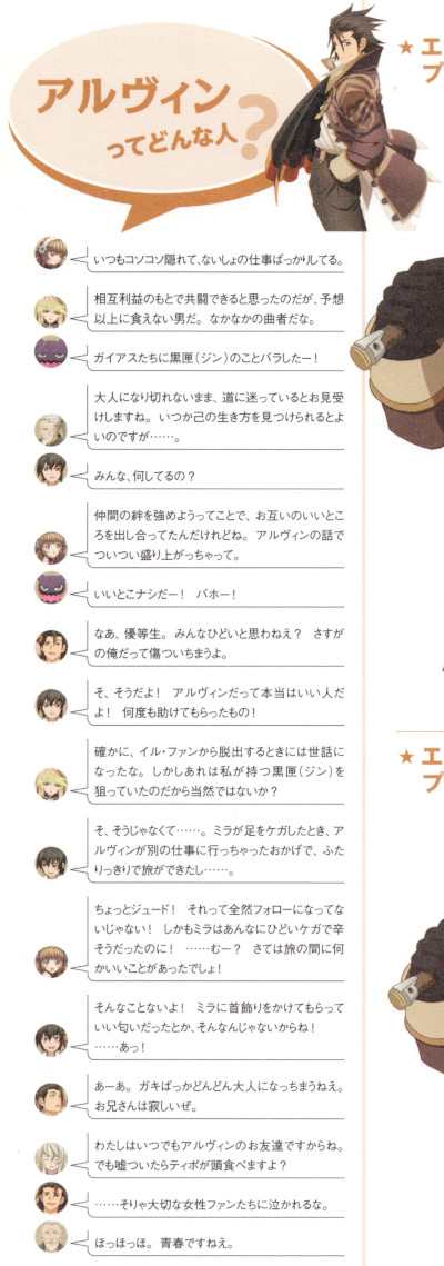テイルズオブエクシリアで見ることができるロングチャットから、8つのテーマ別に厳選された下記のチャットが7ページにわたって掲載されています。