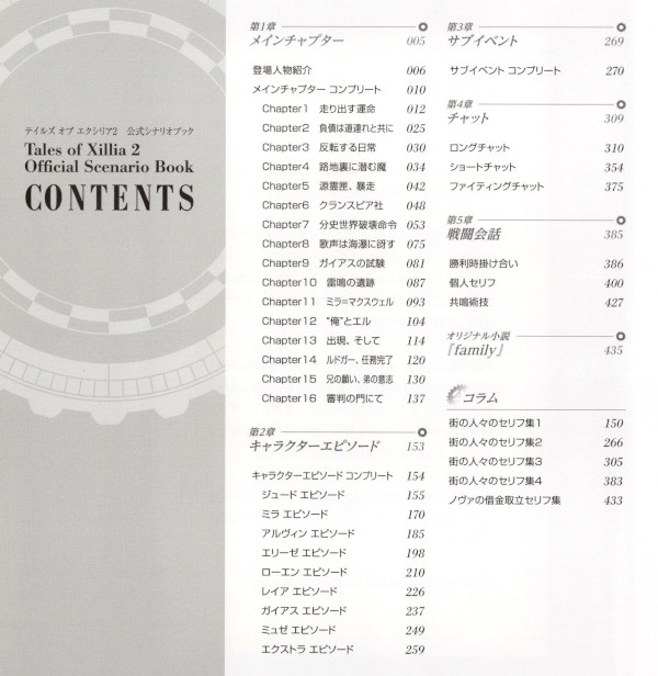「テイルズオブエクシリア2 公式シナリオブック」の目次ページ