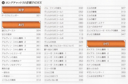 「テイルズオブエクシリア2 公式シナリオブック」に載っているロングチャットの五十音順インデックス