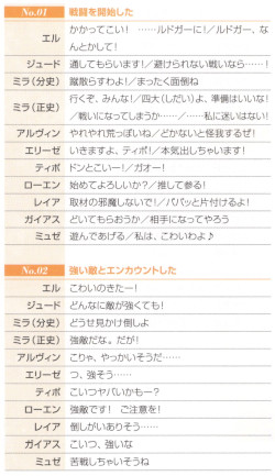 「テイルズオブエクシリア2 公式シナリオブック」ファイティングチャットセリフ集の冒頭2ページ