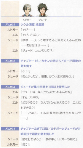「テイルズオブエクシリア2 公式シナリオブック」に載っているファイティングチャットのセリフ集から2つを抜粋したもの