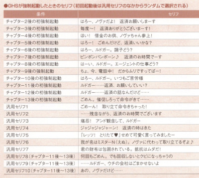 「テイルズオブエクシリア2 公式シナリオブック」に載っているコラム「ノヴァの借金取り立てセリフ集」のGHSが強制起動した時のセリフ一覧